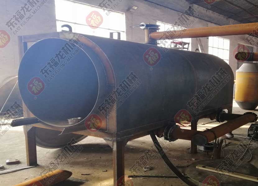 炭化設備包括:炭化主體、進料輸送裝置、螺旋進料機、炭化供熱裝置、儲炭箱、冷卻出料裝置、控制柜。物料通過輸送帶至螺旋進料機再送至炭化爐反應室內,在無氧條件下進行炭化,初始供熱采用天然氣供熱,之后利用原料炭化過程中產生的氫氣、甲烷、一氧化碳的生物質混合燃氣作為自身的熱能進行循環供熱。物料在無氧高溫狀態下,迅速炭化生產炭粉,在主體絞龍的動力作用下,將炭粉送入儲炭箱,經自動出料裝置輸送出。炭化產生的廢氣經