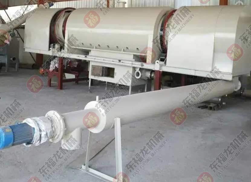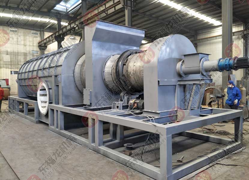 經分揀后的生活垃圾,先進行破碎到合適的粒度,然后就可以進行炭化。垃圾炭化設備,采用的是旋轉式滾筒炭化,旋轉中向前推進不斷均勻受熱、翻轉進行升溫和煙氣揮發,垃圾炭化后在外部循環冷卻水的不斷泠卻下迅速泠卻拉出堆置。此工藝設備簡單,布局合理,熱風管道短,熱損失少,安全、緊湊、節能的工藝設計,使用效果理想。碳化機前期的熱量提供由燃煤手燒爐或生物質氣化爐燃燒直接提供,燃燒后的氣體和碳化機內部可燃氣體燃燒后在